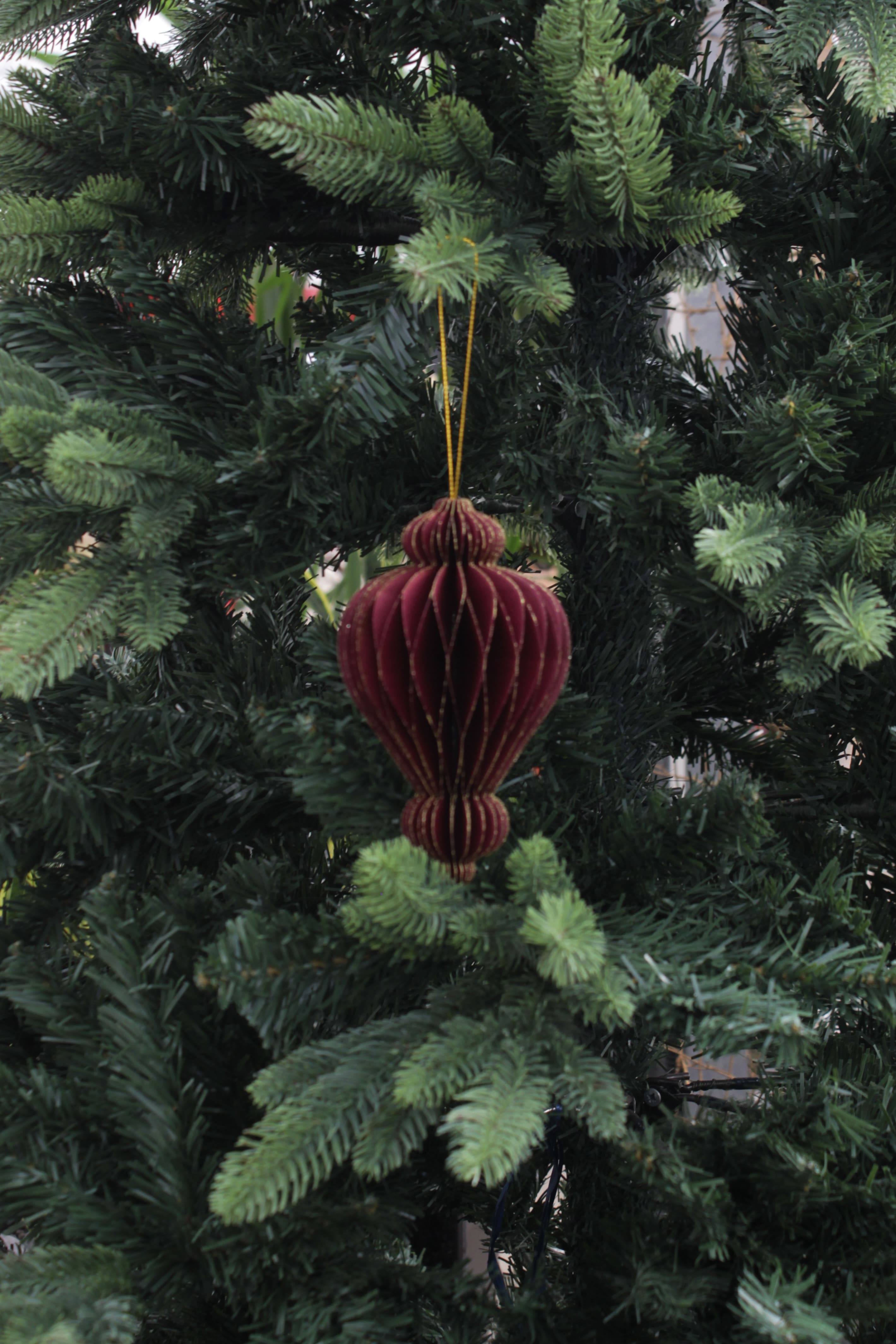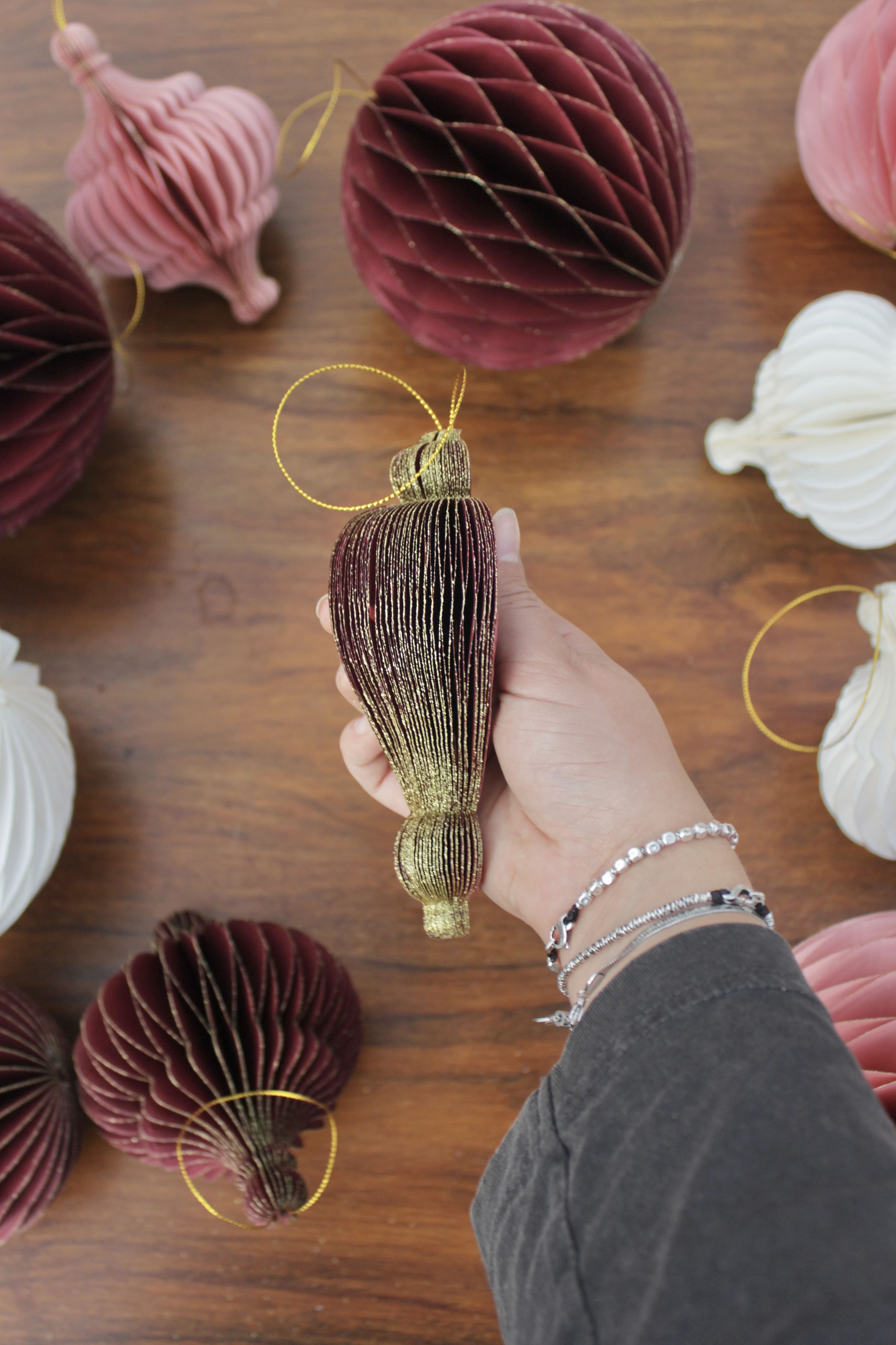 Decorazioni natalizie realizzate in carta colorata con la tecnica dell’origami. Disponibile in bianco, rosa e borgogna anche a forma di trottola e spirale.
