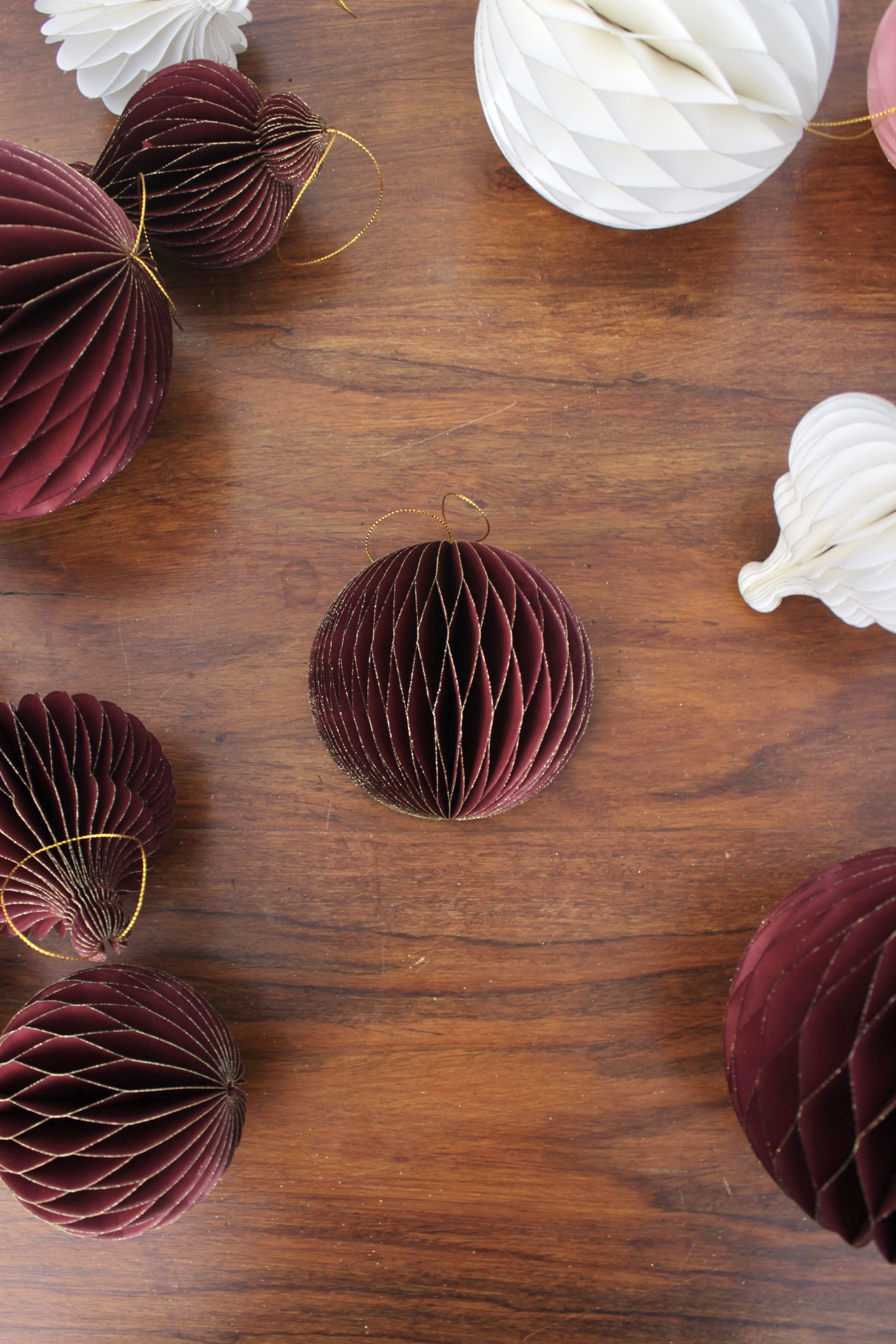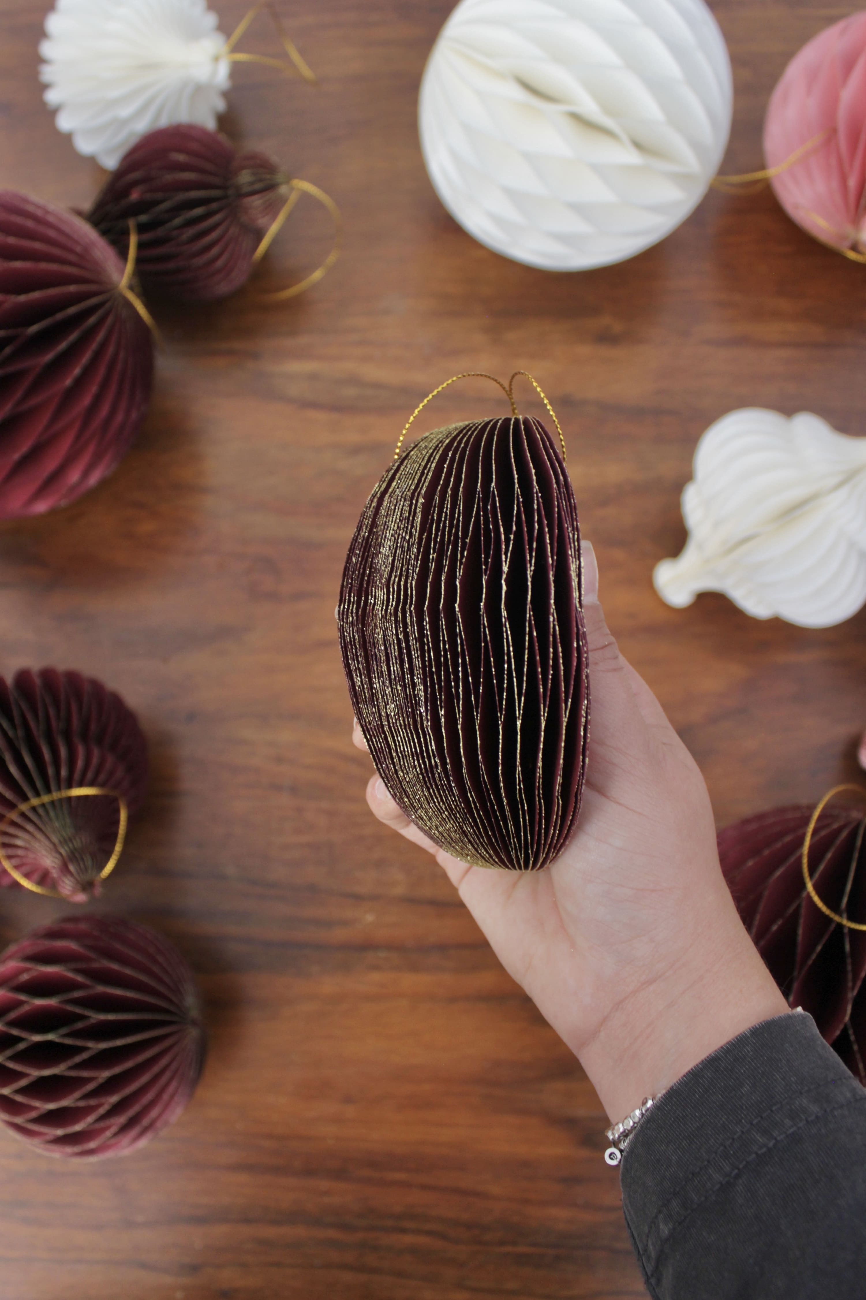 Decorazioni natalizie realizzate in carta colorata con la tecnica dell’origami. Disponibile in bianco, rosa e borgogna anche a forma di trottola e spirale.