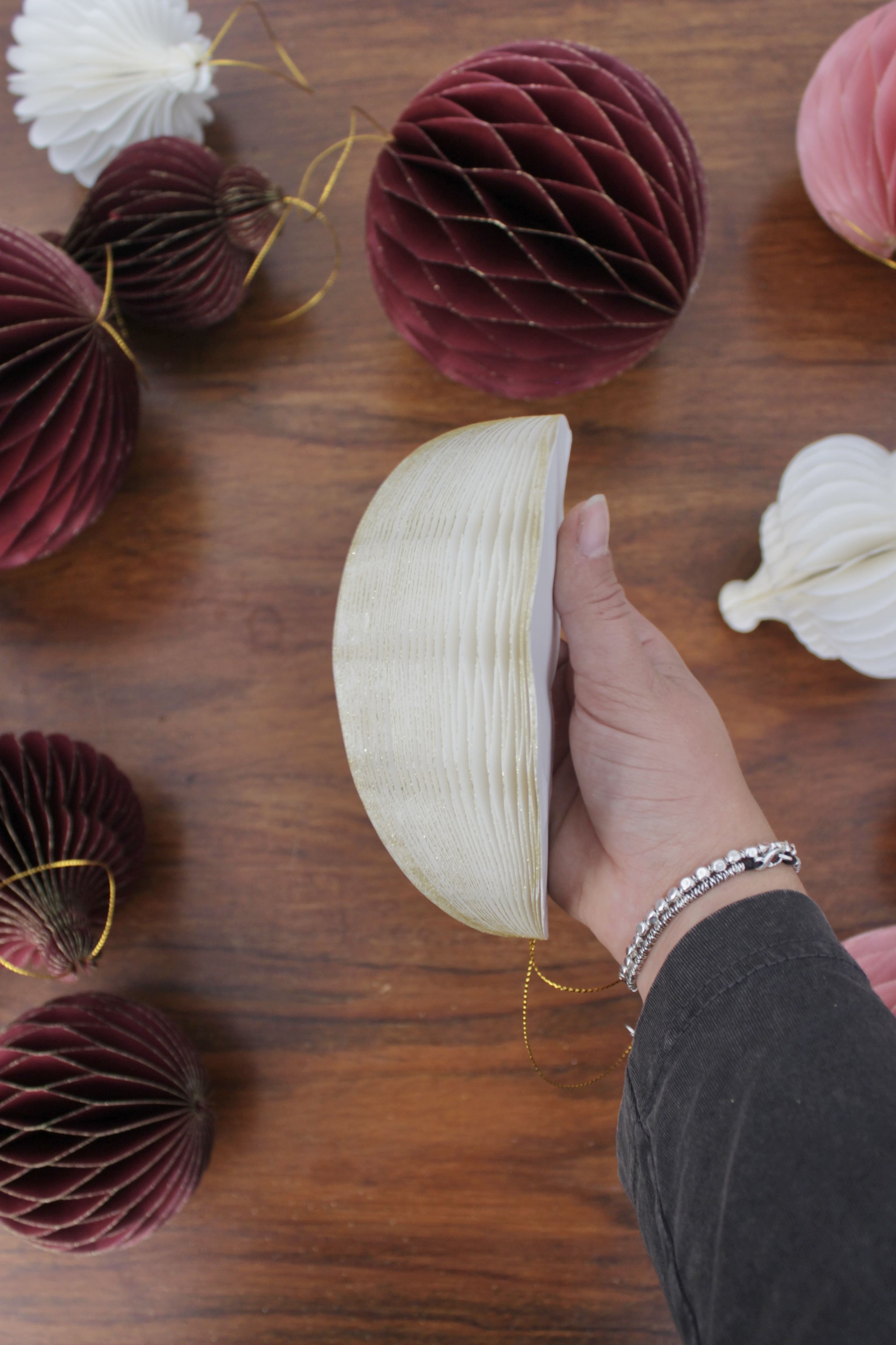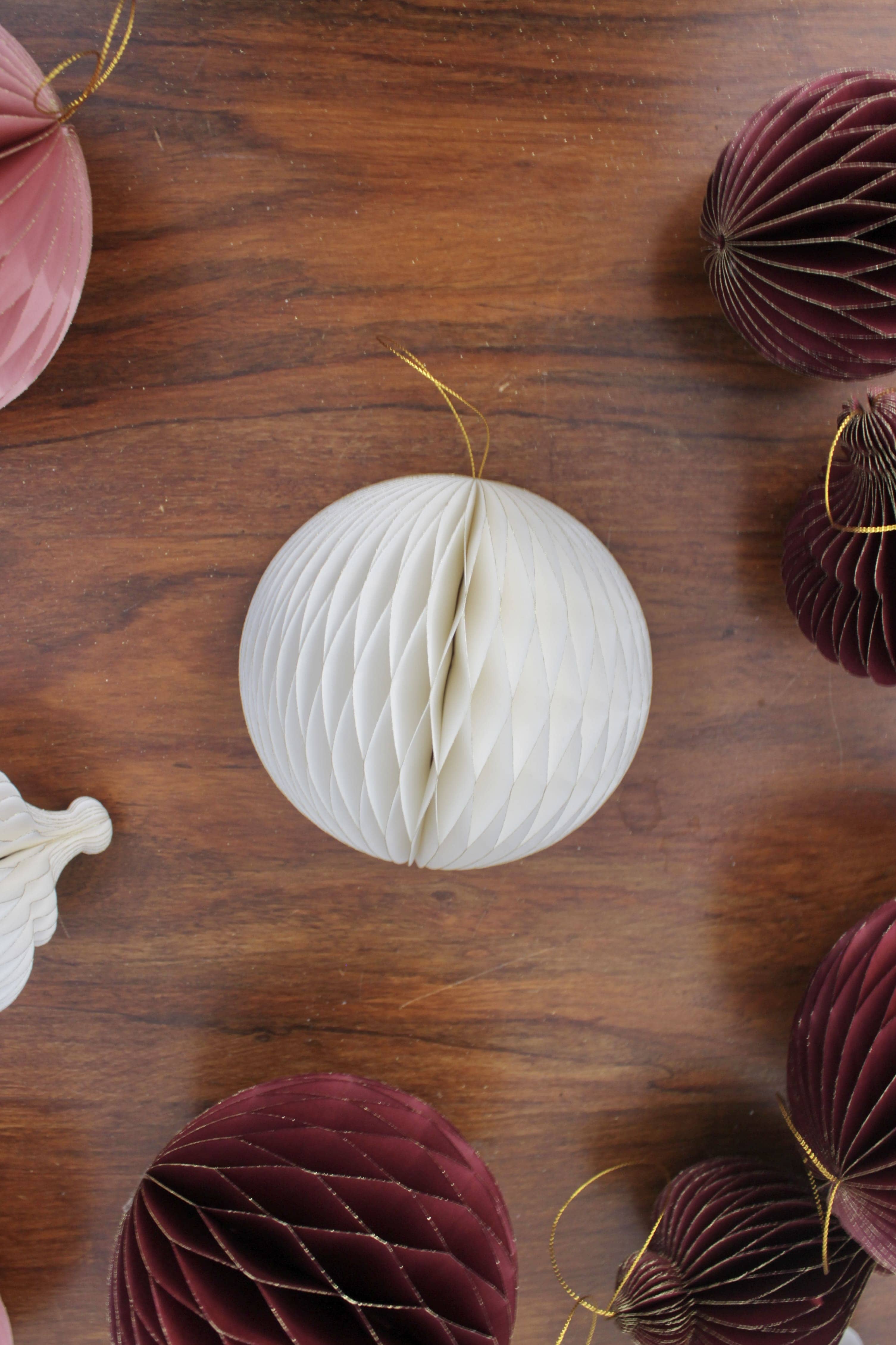 Decorazioni natalizie realizzate in carta colorata con la tecnica dell’origami. Disponibile in bianco, rosa e borgogna anche a forma di trottola e spirale.