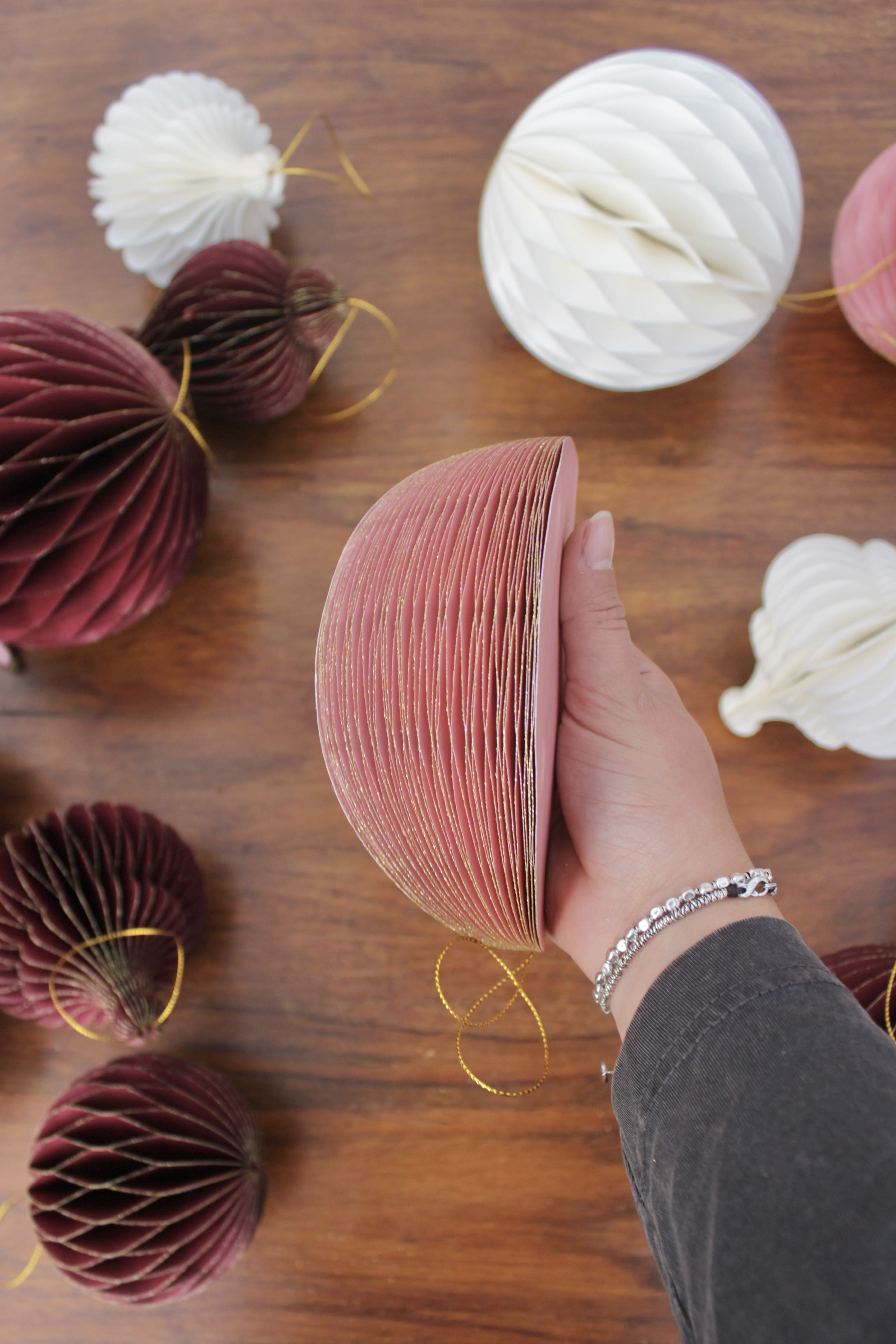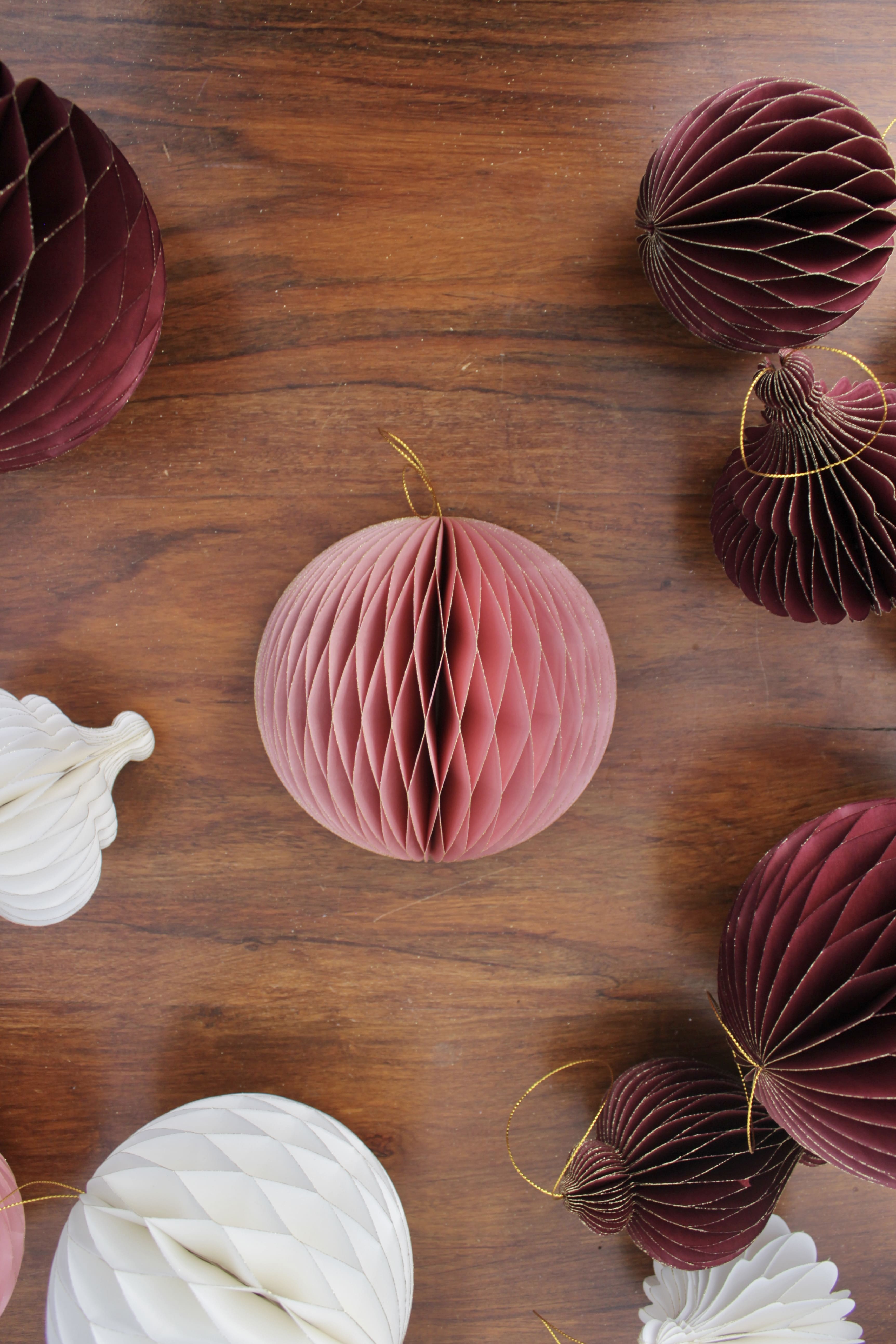Decorazioni natalizie realizzate in carta colorata con la tecnica dell’origami. Disponibile in bianco, rosa e borgogna anche a forma di trottola e spirale.