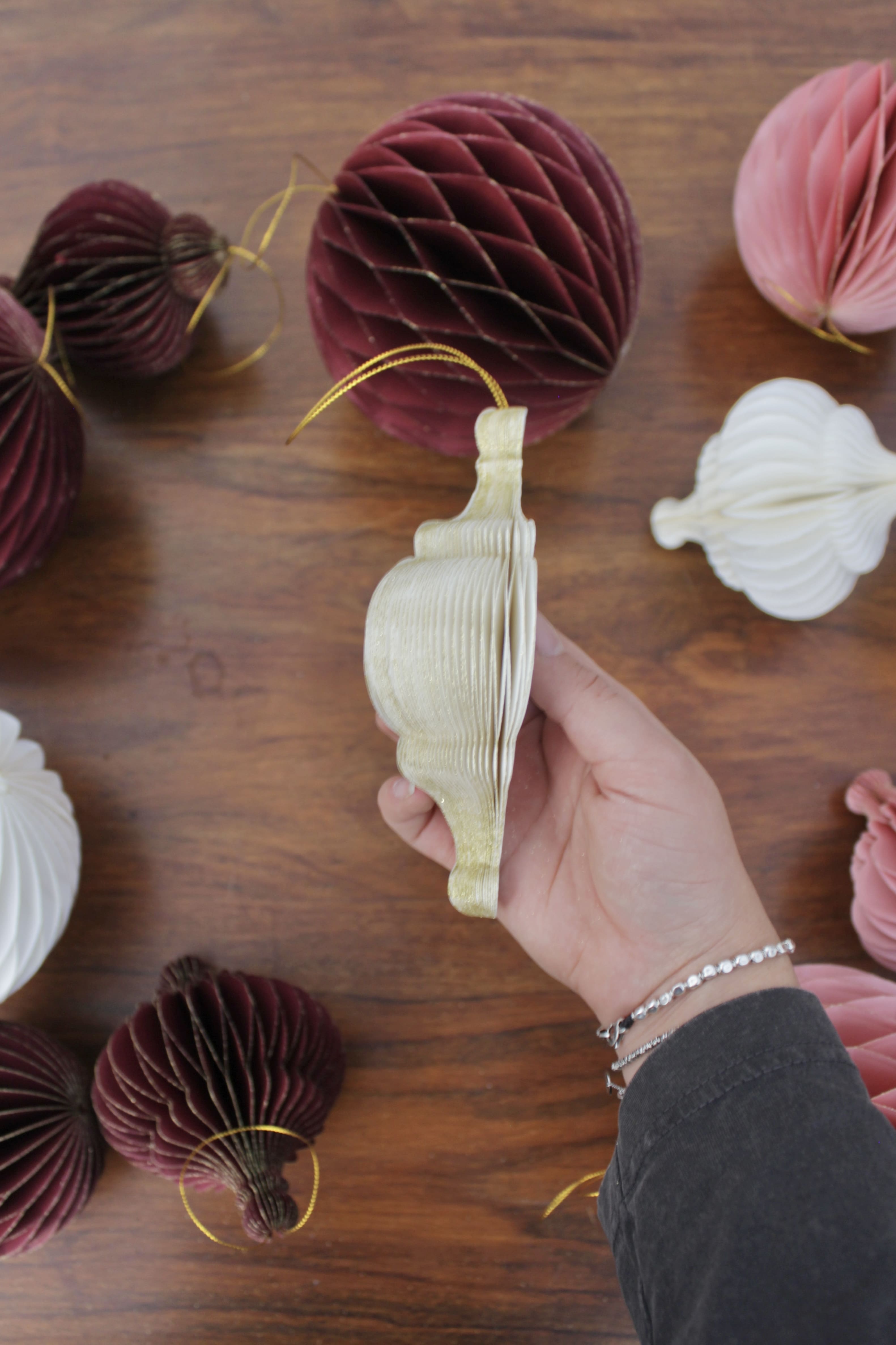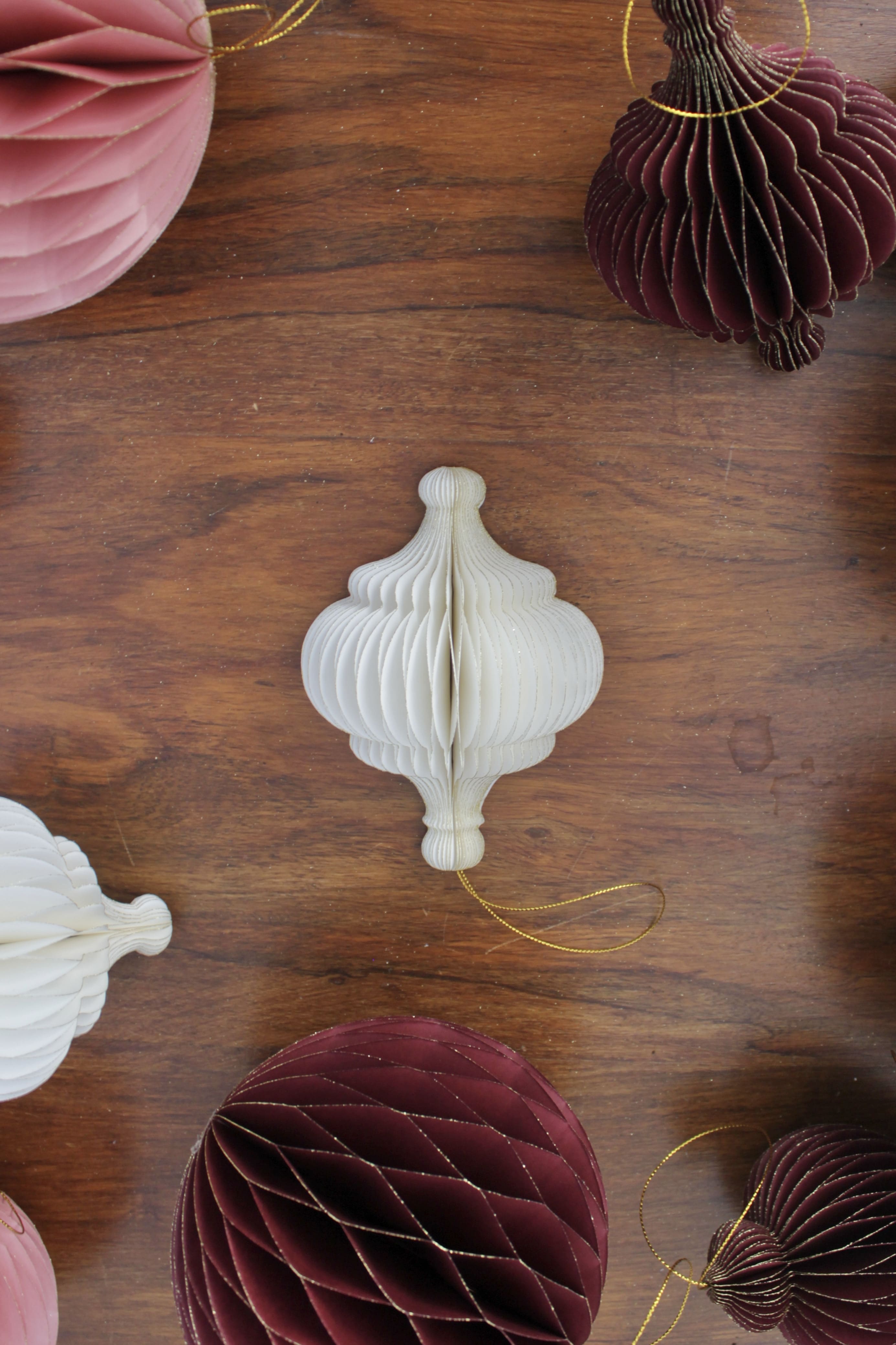 Decorazioni natalizie realizzate in carta colorata con la tecnica dell’origami. Disponibile in bianco, rosa e borgogna anche a forma di trottola e spirale.