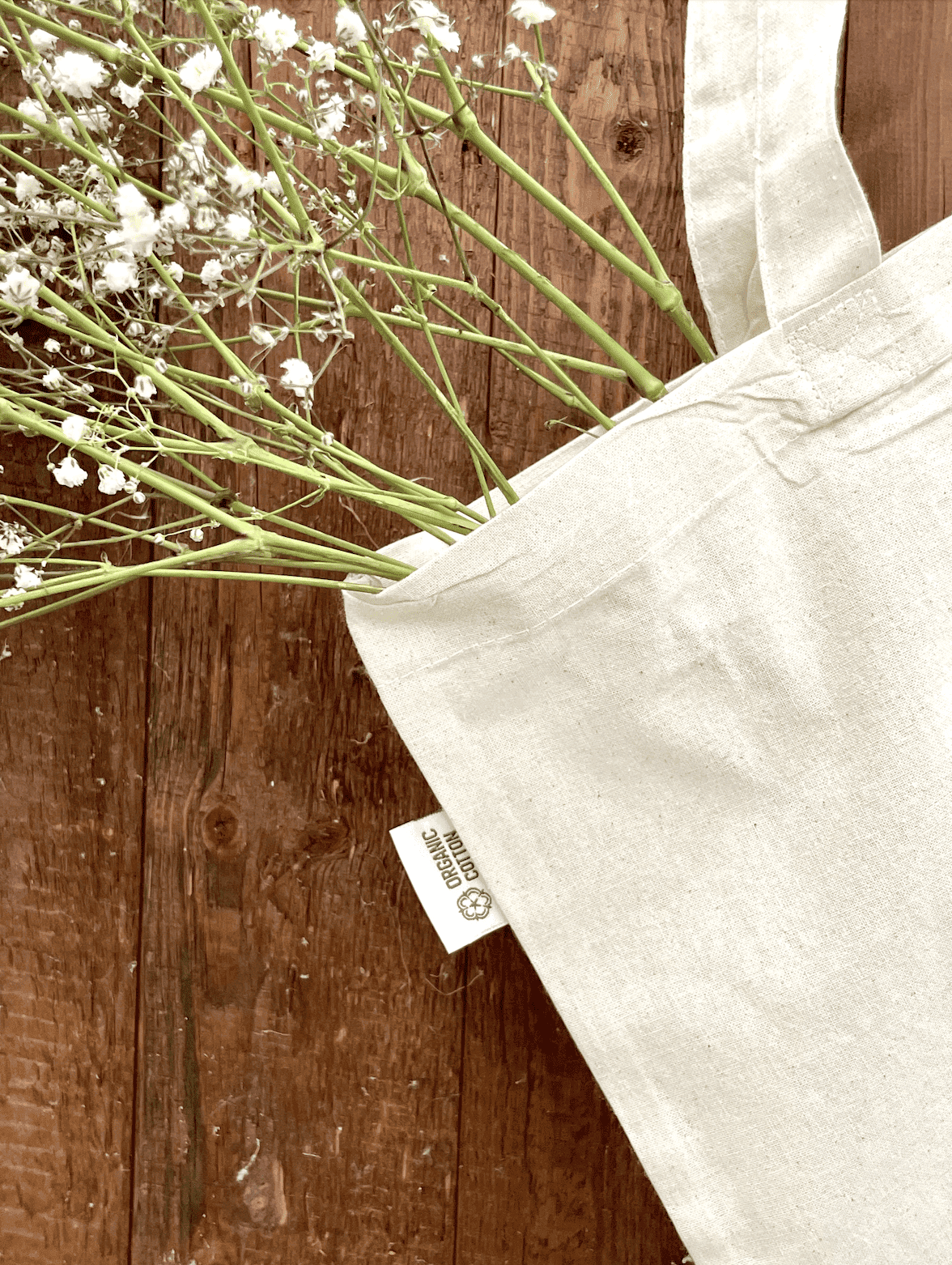Shopper in cotone riciclato con stampe resistenti ai lavaggi.