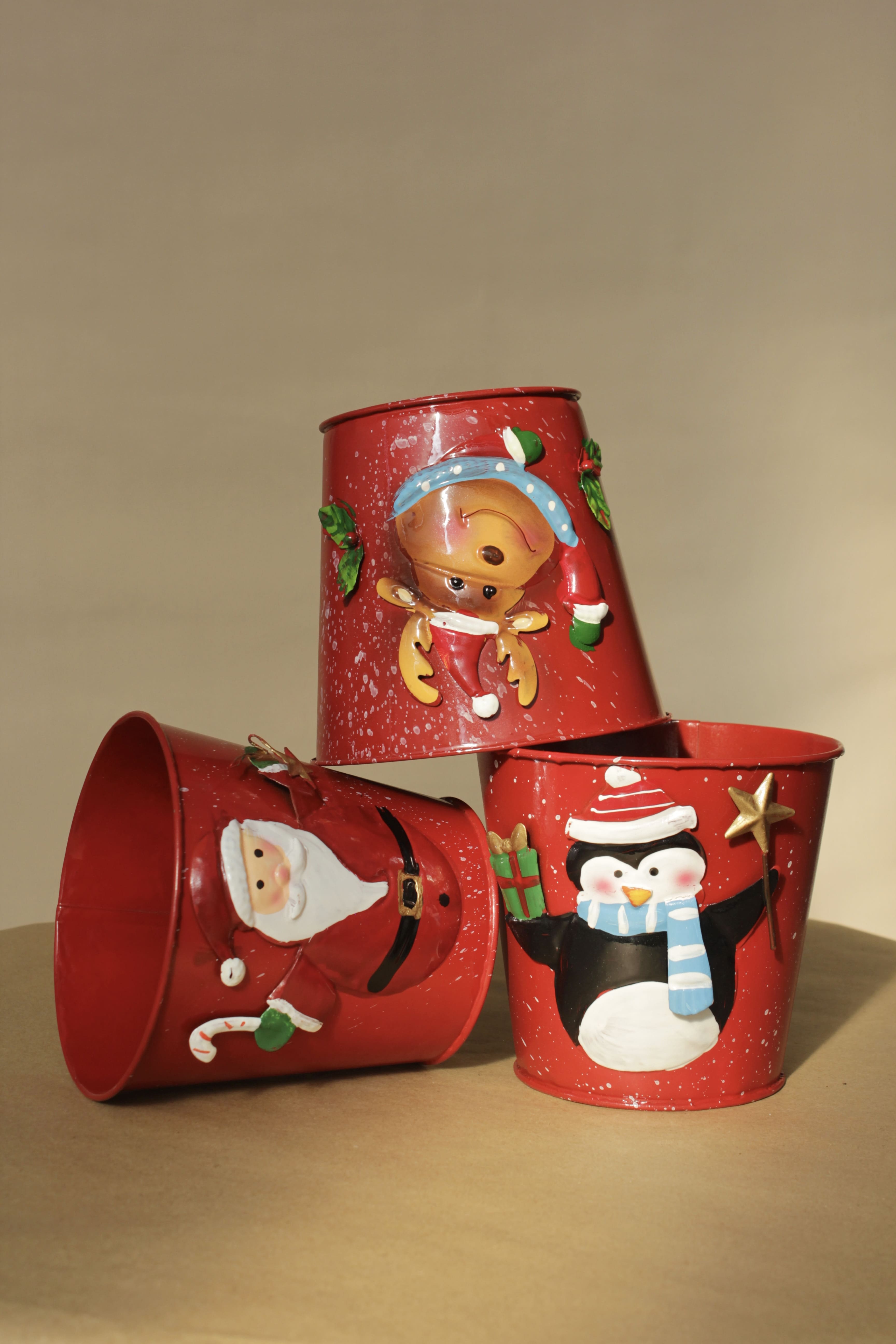 Vasetto in latta di colore rosso con applicazioni a tema natalizio.